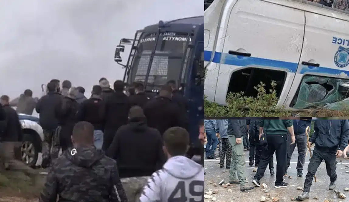 Οι αγρότες στα Χανιά βανδάλισαν και αναποδογύρισαν ένα περιπολικό, ενώ από τα επεισόδια έχουν τραυματιστεί δύο αστυνομικοί. Παράλληλα, ζημιές υπέστη και η κλούβα της αστυνομίας από τον πετροπόλεμο, η οποία απομακρύνθηκε. Οι πέτρες στο οδόστρωμα είναι αμέτρητες, όπως φαίνεται χαρακτηριστικά και από τις παρακάτω φωτογραφίες.