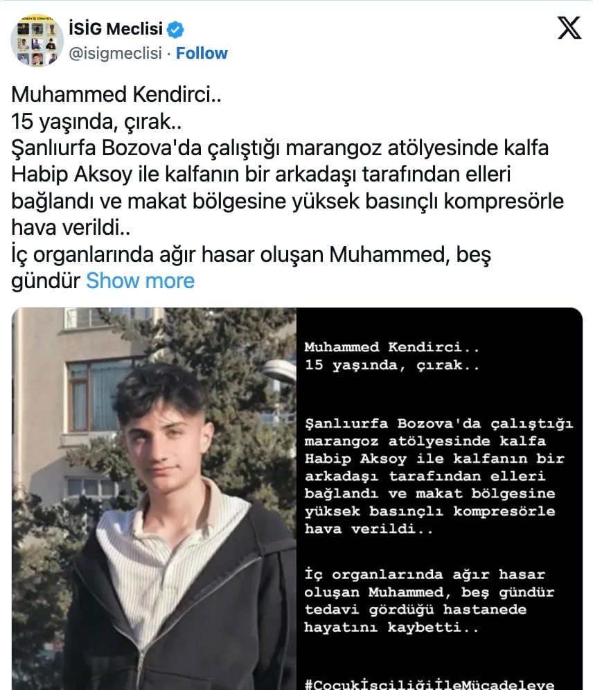Ο μαθητευόμενος διακομίστηκε αρχικά στο κρατικό νοσοκομείο Μποζόβα Μεχμέτ Ενβέρ Γιλντιρίμ και αργότερα μεταφέρθηκε στο νοσοκομείο Μπαλικλίγκολ. Τελικά, μεταφέρθηκε στο Νοσοκομείο Έρευνας και Εφαρμογής του Πανεπιστημίου Χαράν, όπου οι γιατροί επιβεβαίωσαν σοβαρές βλάβες σε εσωτερικά όργανα.